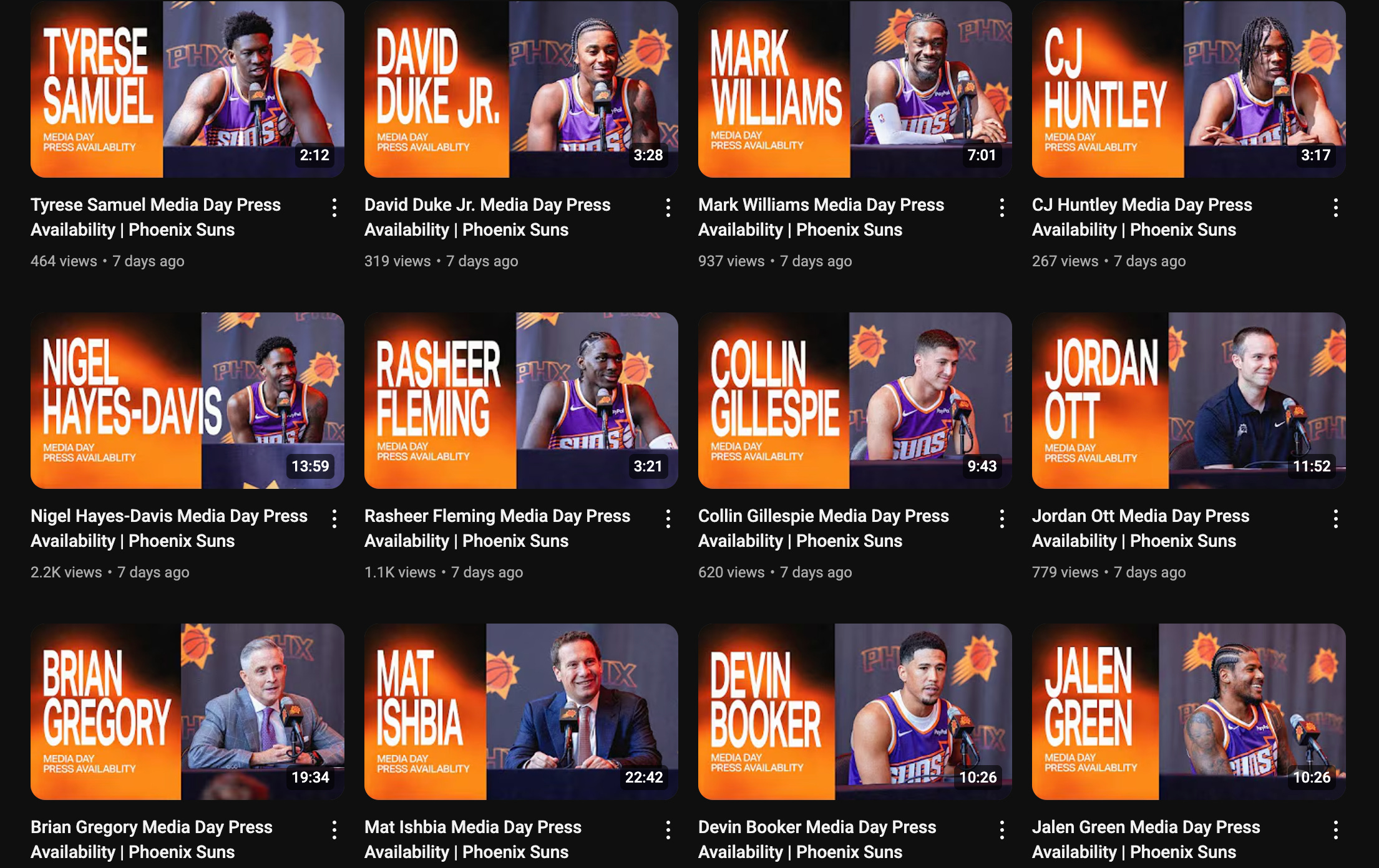 The Phoenix Suns, facing a string of lawsuits reported by ESPN’s Baxter Holmes, have posted dozens of press conferences since Media Day, including that of the owner, president, general manager, head coach and 21 different players.