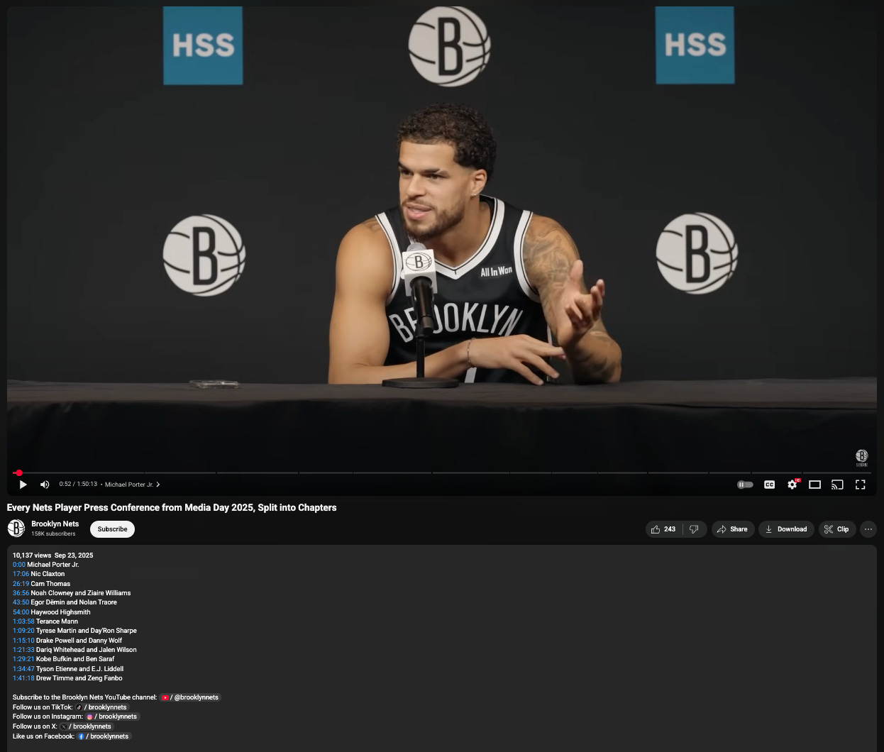 How’s this for transparency? The Brooklyn Nets even posted a 110-minute supercut of every player press conference with timestamps listing 21 names. Dying to hear 21 different Brooklyn Nets players talk about how they’re in the best shape of their life? You’ve come to the right place!