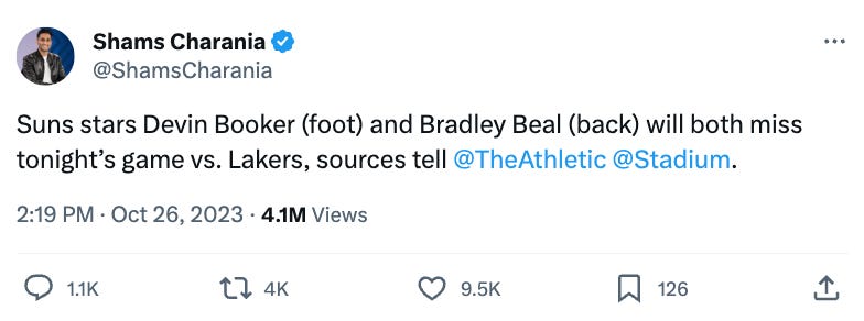 Less than eight hours before Thursday’s tipoff between the Phoenix Suns and Los Angeles Lakers, Shams Charania broke some news that will upset many in the NBA business: Devin Booker and Bradley Beal – two-thirds of the Suns’ star trio – would be missing the blockbuster matchup on TNT.