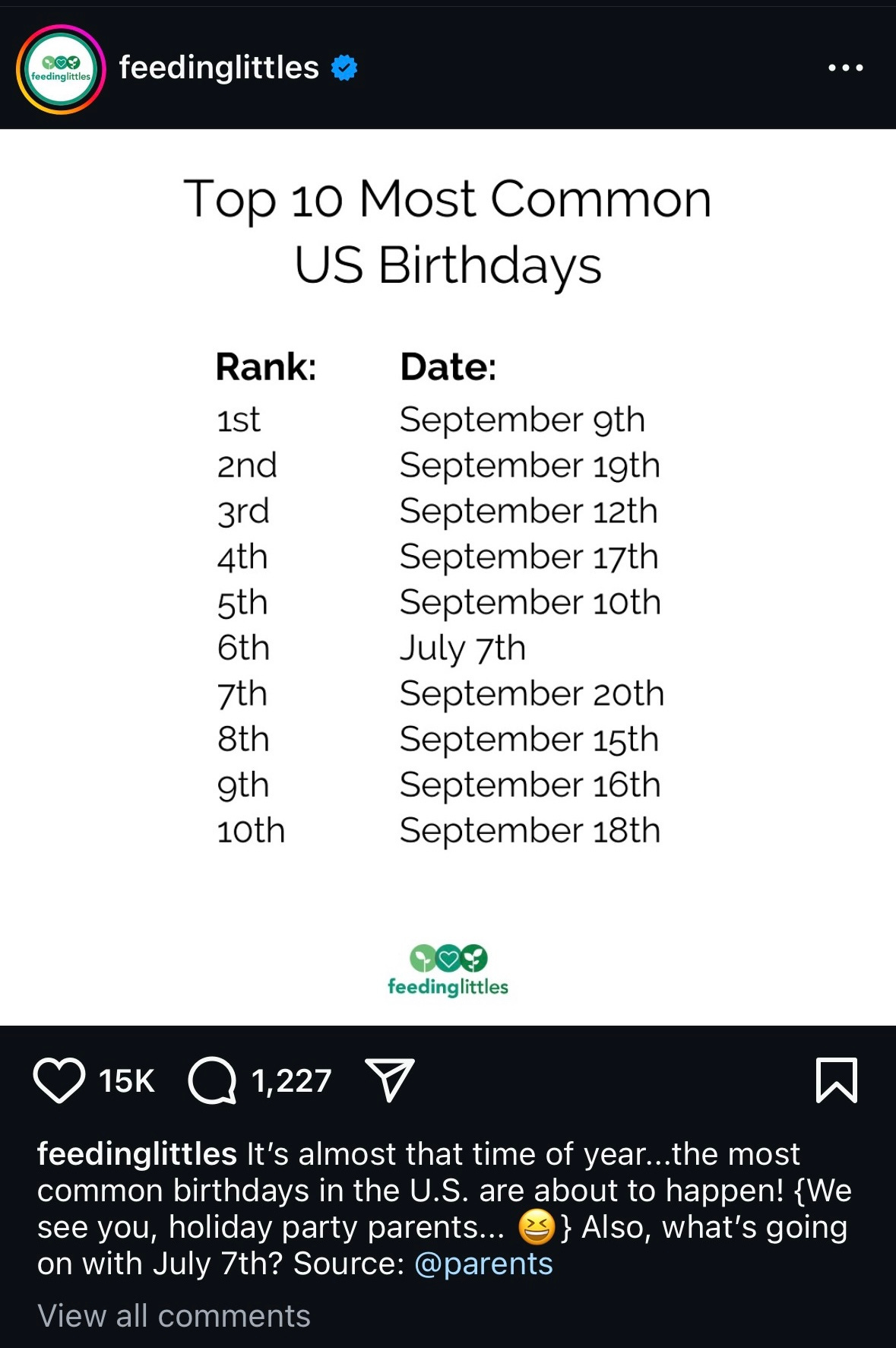 The post showed that of the Top 10 most popular birthdays in the United STate, nine of them are in the month of September. This generated a genuine “WHAT!” out of my gullet despite the fact that, of my two kids, one was born in, yup, September.