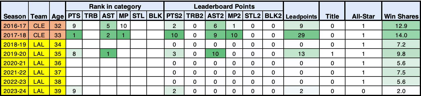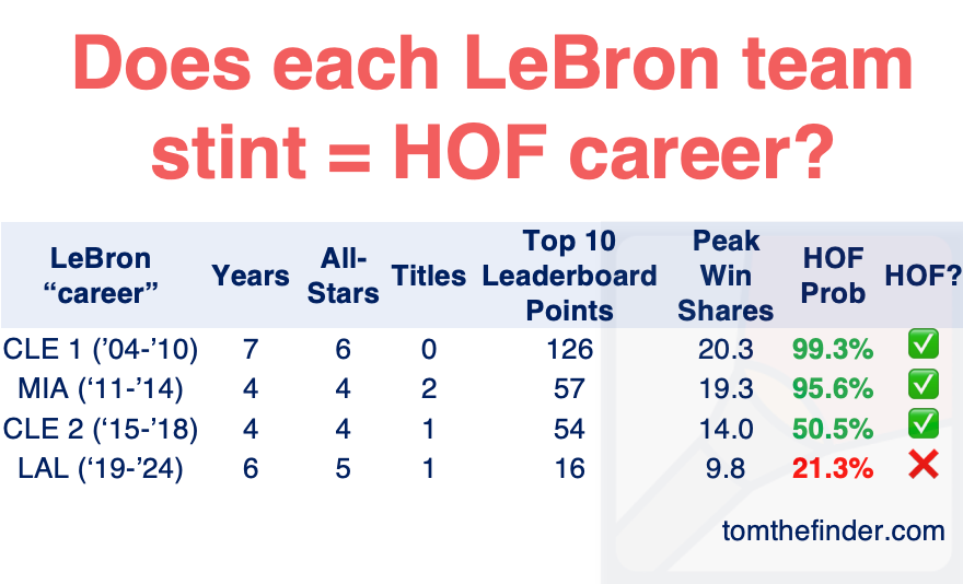 When I deconstruct his career this way and plug the numbers into the formula, James’ Lakers’ stint from 2018-19 to 2023-24 falls short. It generates a Hall of Fame probability of “only” 21.3 percent.