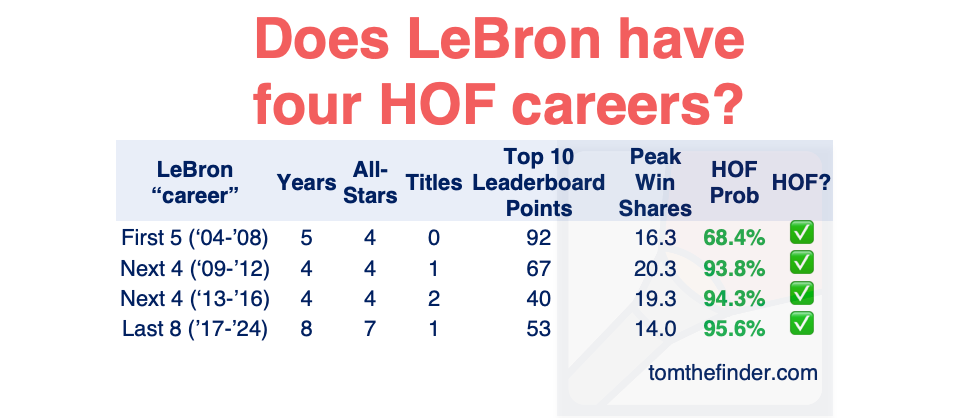 But here’s my question: How many LeBrons could make the Hall? As in, could we break LeBron’s career into sections and have each component be worthy of Hall of Fame induction?