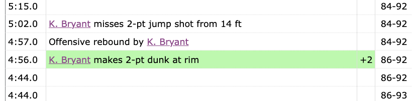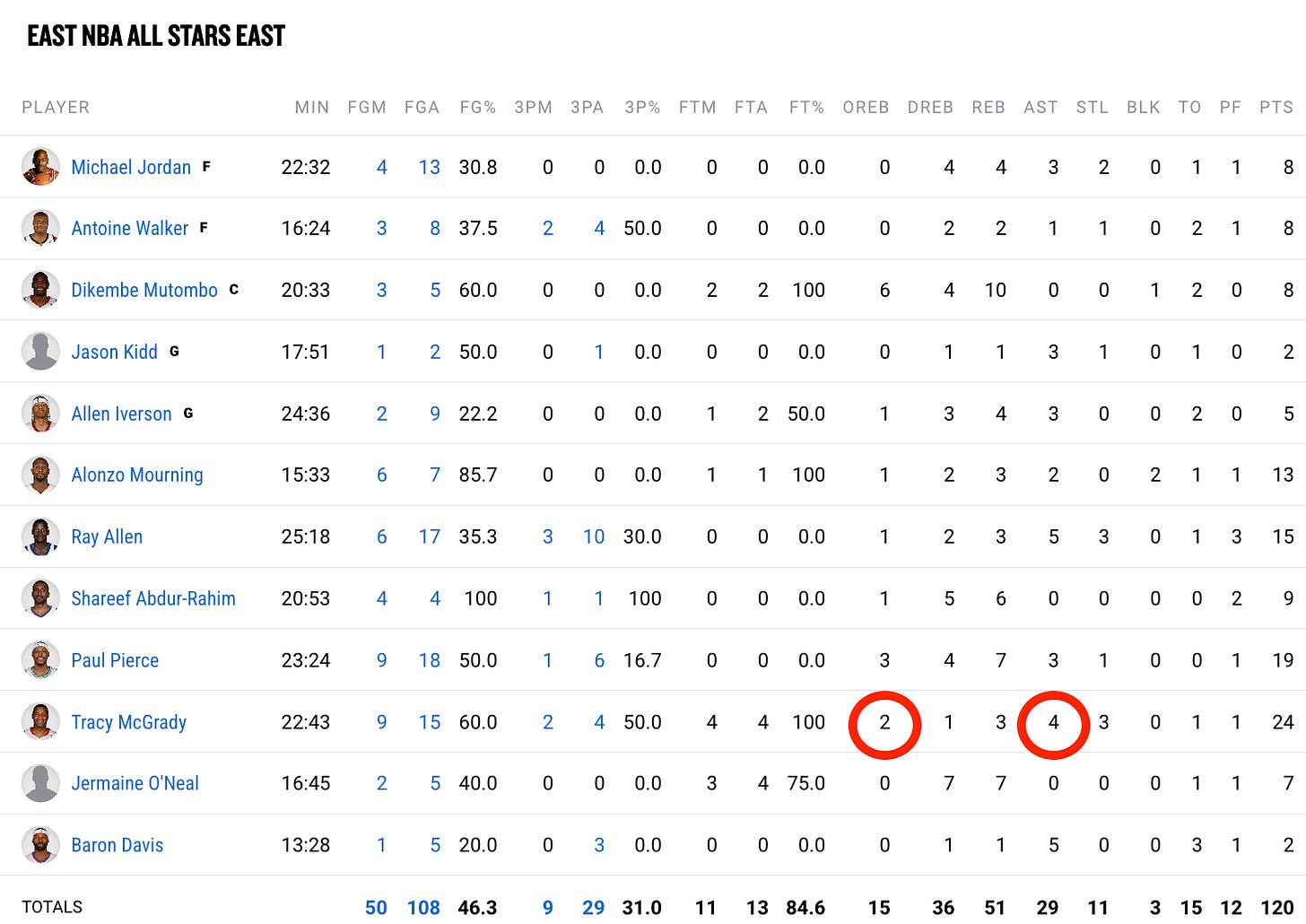 I need to get to the bottom of this. I wanted to see how Tracy McGrady’s famous one from the 2002 All-Star game was registered in the scorebook. I know we have play-by-play data going back to 1996-97, but the T-Mac one took place in an exhibition. I looked it up.