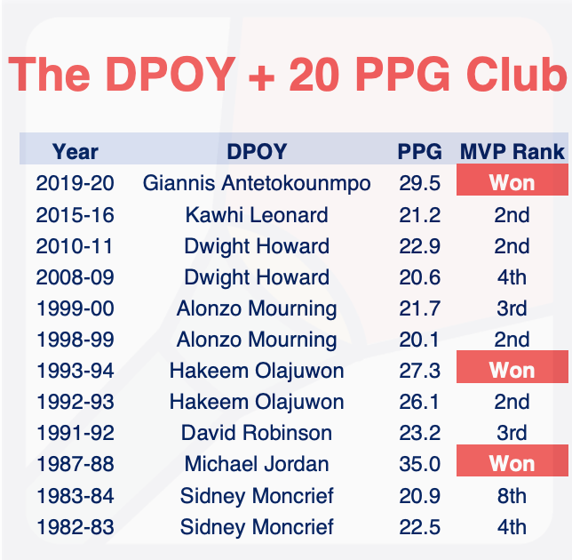 Of the last 10 DPOYs who averaged at least 20 points per game, three of them won MVP, four finished second, two placed third and one (Dwight Howard in 2008-09) didn’t medal, landing at fourth.