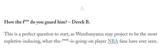 To wit, one of the sharpest draft scouts on the planet, Sam Vecenie of The Athletic, answered a Wemby mailbag this week. It was a great read; Sam has watched Wembanyama more than just about anyone. The first question was not about his defense. It was this: