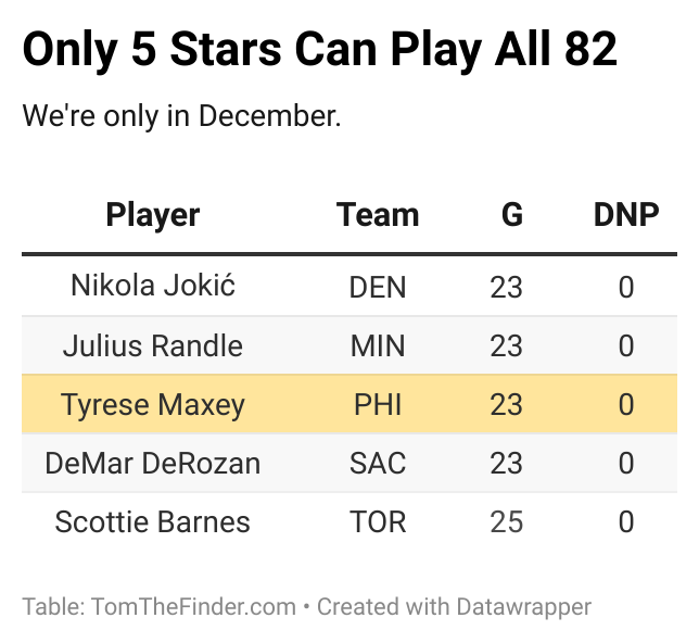 Here’s why Maxey is so unique. It’s not yet Christmas and there are only five stars who have played in every game this season. Maxey is one of them. Nikola Jokić is another. Julius Randle, DeMar DeRozan and Scottie Barnes are the three others. And that’s it.