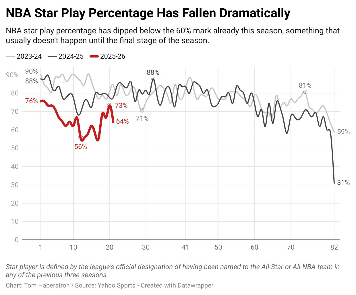 It’s been three weeks since I sounded the alarm over at Yahoo about the unavailability of NBA stars. The league found itself in an injury crisis, the likes of which we haven’t seen in November. After a brief respite where star participation rose to 73%, it’s tumbling and tumbling again.