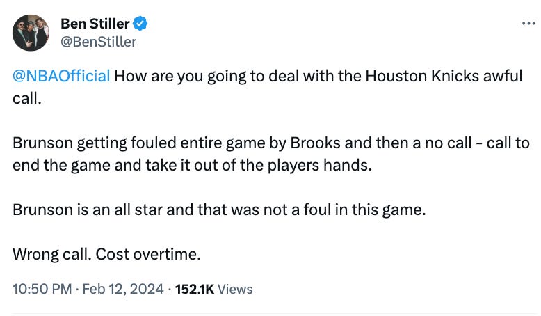 I chuckled at Stiller’s assertion that Brunson should get star treatment now. After all, what’s the point of making an All-Star team if you can’t get All-Star calls?!